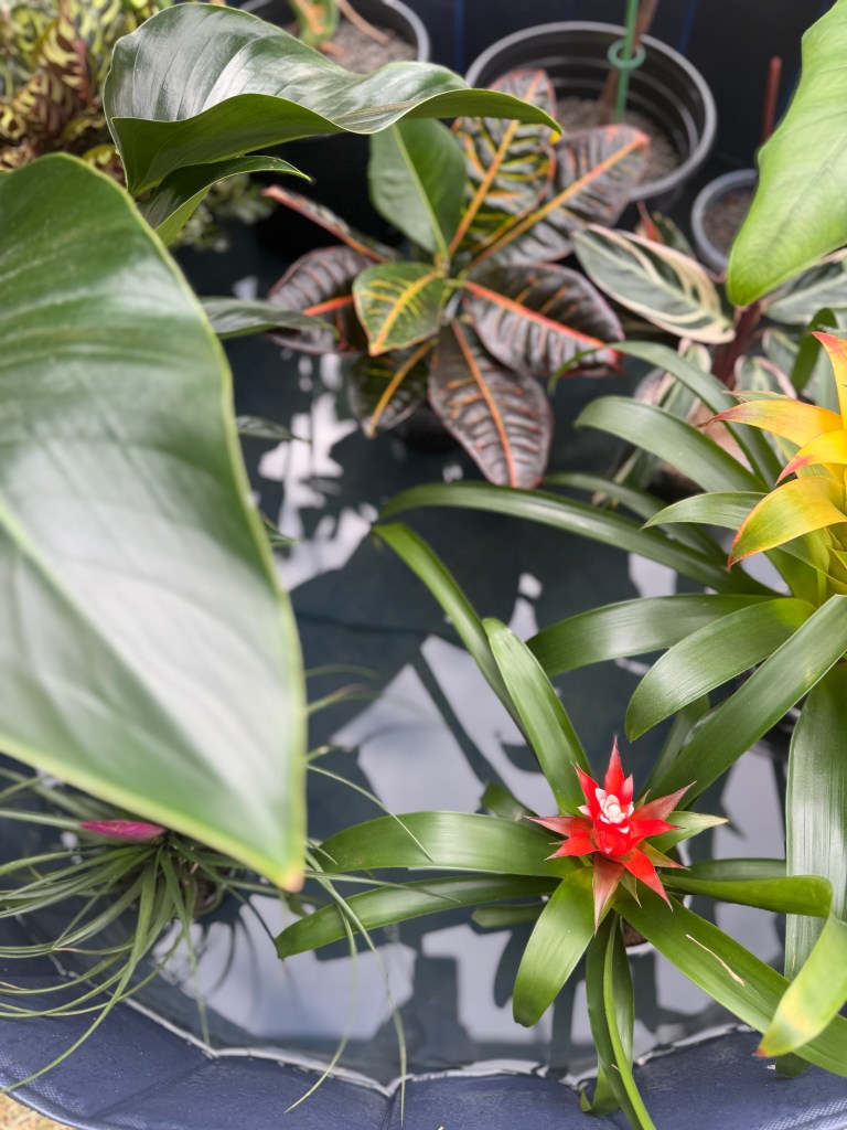 So instead of standing over each plant with a watering can like it’s a full-time job, I grab my collapsible dog pool, mix in my liquid plant food (blog to come), fill the pool with water, and let the plants take care of the rest.