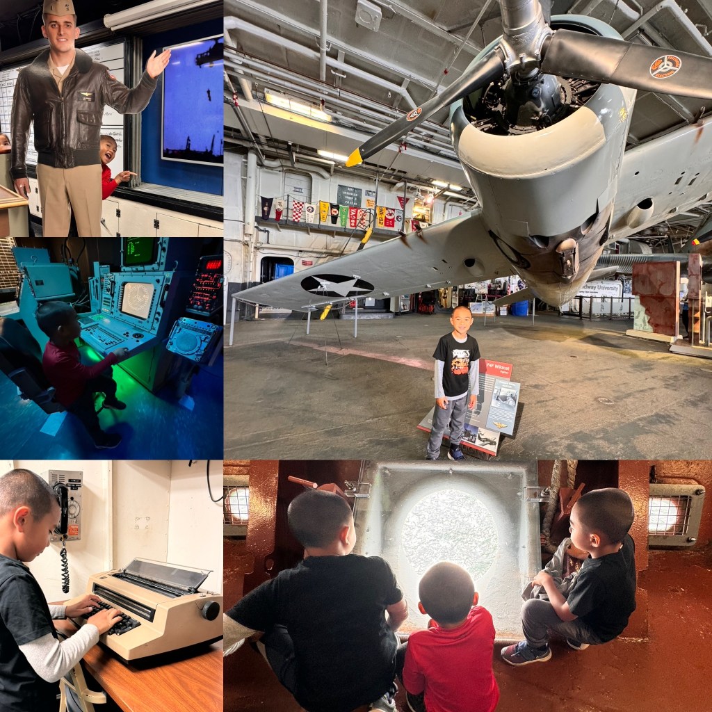 From the moment we stepped onto the massive aircraft carrier, Mai Boys were wide-eyed. It’s hard not to be. You’re standing on a real-deal Navy ship that once carried over 4,000 sailors through missions around the world. And now? It’s parked right in San Diego Bay, open for climbing, exploring, pretending, learning, and, let’s be honest, burning some serious kid energy.