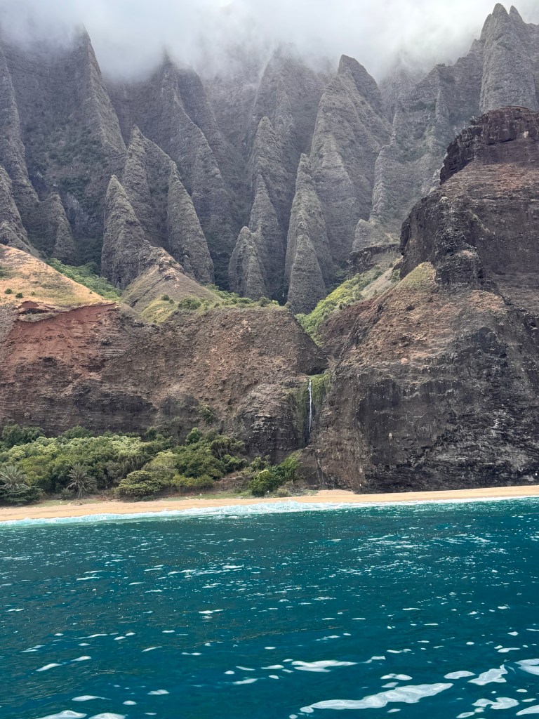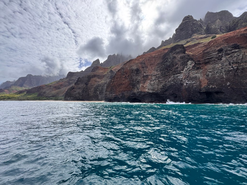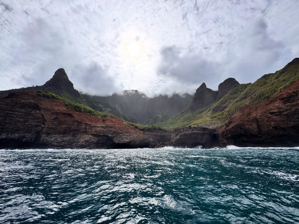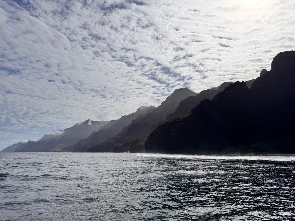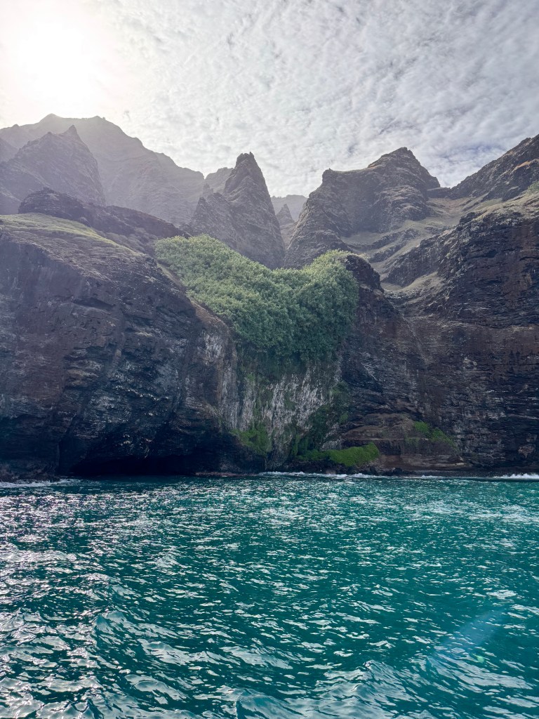 The Na Pali cliffs soar up, draped in valleys, waterfalls, and ridges carved over millions of years by wind and rain. The name “Nā Pali” means “the cliffs”, and it fits- jagged, dramatic, and impossibly green against the deep blue ocean.
